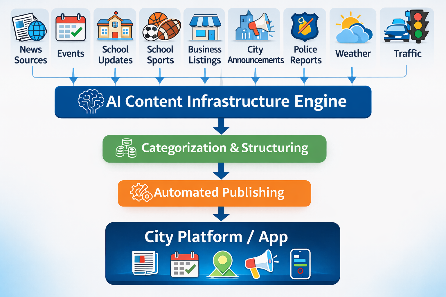 Our AI infrastructure automatically gathers information from multiple local sources and organizes it into a structured publishing system.